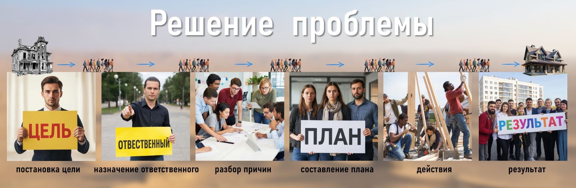 Любая проблема решается именно по такой цепочке: постановка цели решить проблему - назначение ответственного - разбор причин проблемы - составление плана - действия - получение результата.